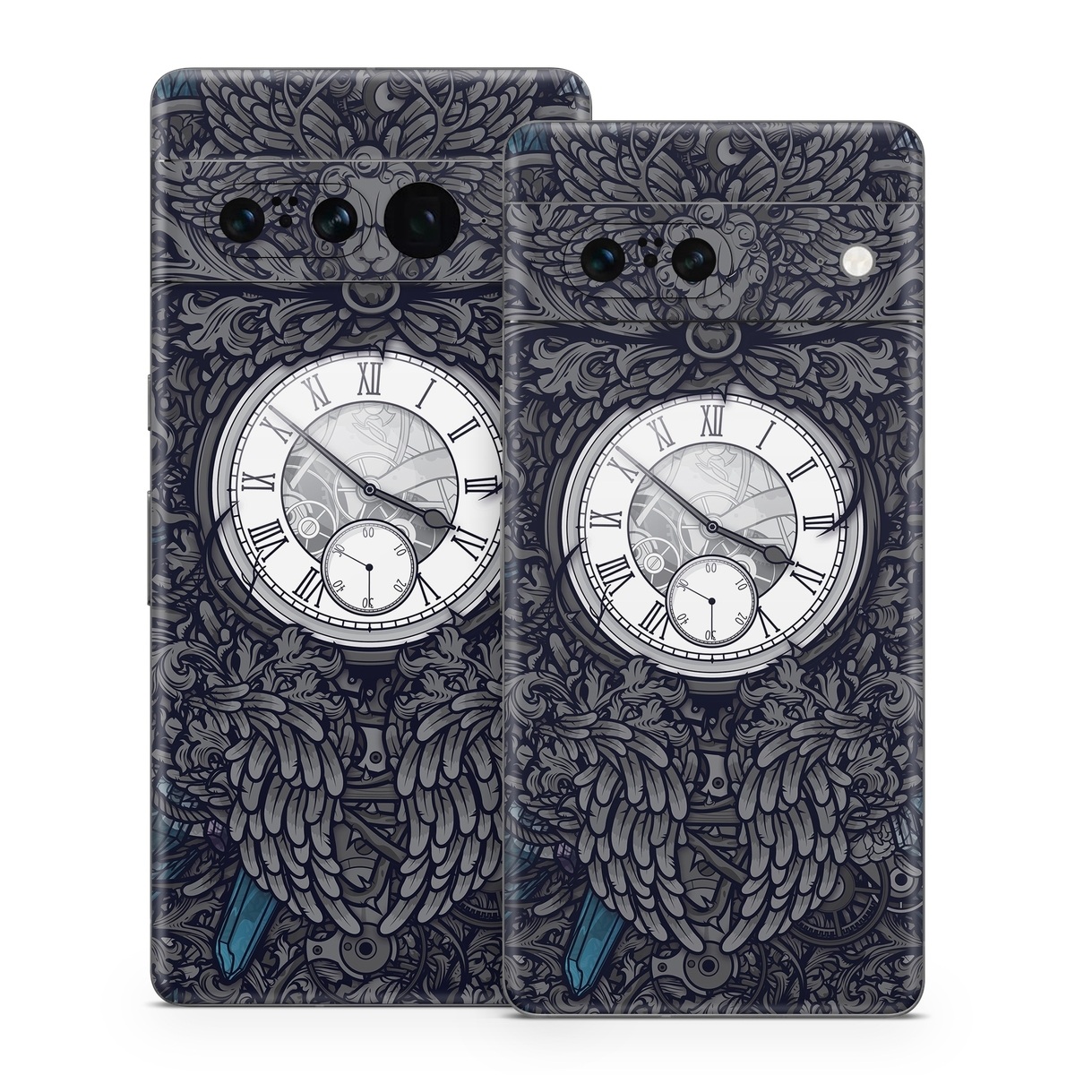 iStyles Google Pixel 7 Series Skin design of Blue, Pattern, Psychedelic art, Design, Circle, Art, Font, Graphic design, Visual arts, Illustration, with black, gray colors, and tagged with objects, patterns, animals, grandfather, clock, clocks, alarm, time, antique, table.