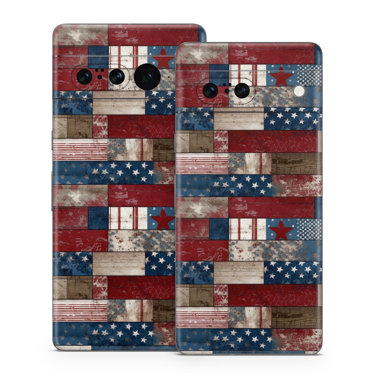 iStyles Google Pixel 7 Series Skin design of Photograph, White, Blue, Rectangle, Azure, Textile, Creative arts, Red, Line, Art, with red, blue, white, brown, gray, black colors, and tagged with flags, patterns, signs, united, states, flag, wooden, panels, mosaic, worn.