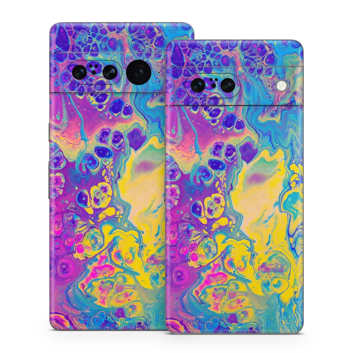 iStyles Google Pixel 7 Series Skin design of Psychedelic art, Pattern, Purple, Visual arts, Design, Art, Fractal art, Electric blue, Graphic design, Graphics, with blue, yellow, purple, pink colors, and tagged with abstract, fantasy, marble, paint, painting, rainbow, soap, tiedye.
