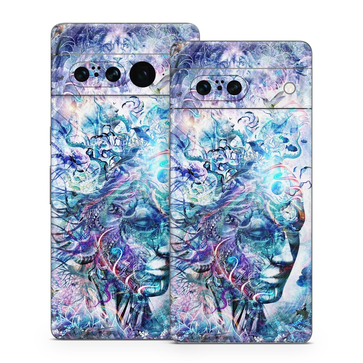 iStyles Google Pixel 7 Series Skin design of Psychedelic art, Water, Fractal art, Art, Pattern, Graphic design, Design, Illustration, Electric blue, Visual arts, with blue, purple, green, red, gray, white colors, and tagged with animals, nature, flowers.