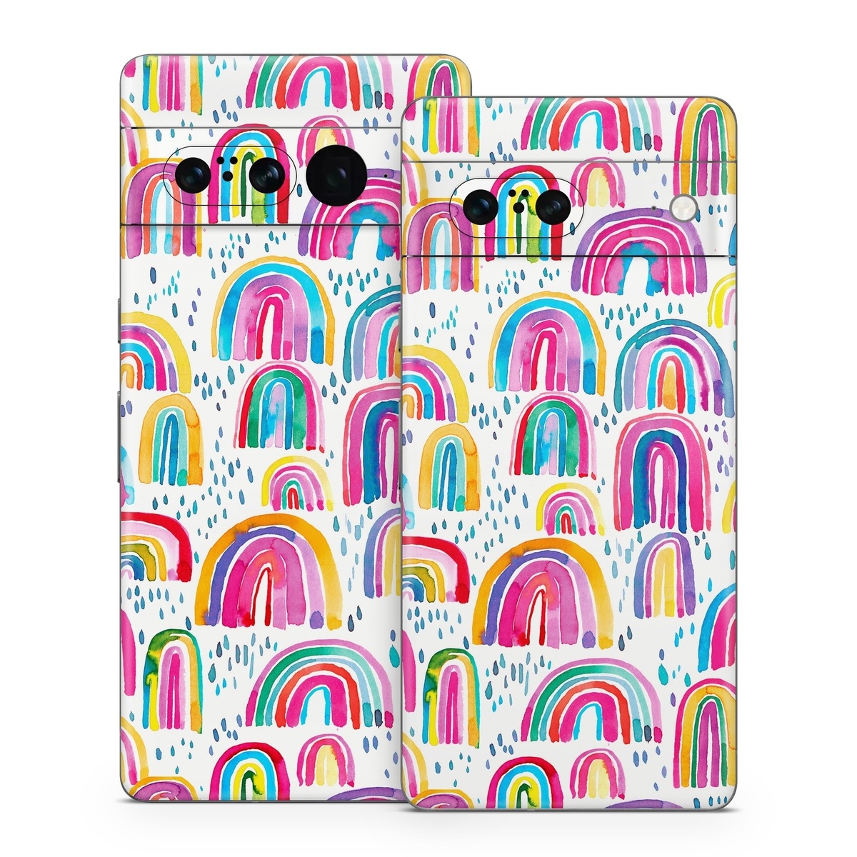 iStyles Google Pixel 7 Series Skin design of Line, Pattern, Design, with white, orange, yellow, blue, pink, red, green colors, and tagged with patterns, nature, abstract, abstract, bright, colorful, rain, nature, rainbow, watercolor.