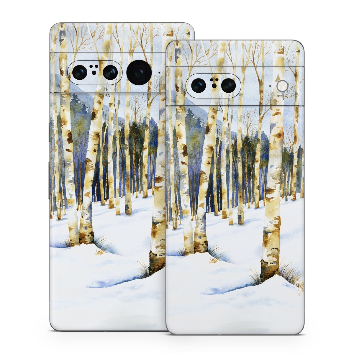 iStyles Google Pixel 7 Series Skin design of Tree, Snow, Winter, Canoe birch, Nature, Birch, Forest, Natural environment, Freezing, Woody plant, with white, brown, black, gray colors, and tagged with patterns, nature, mountain, outdoors, snow, winter, woods.