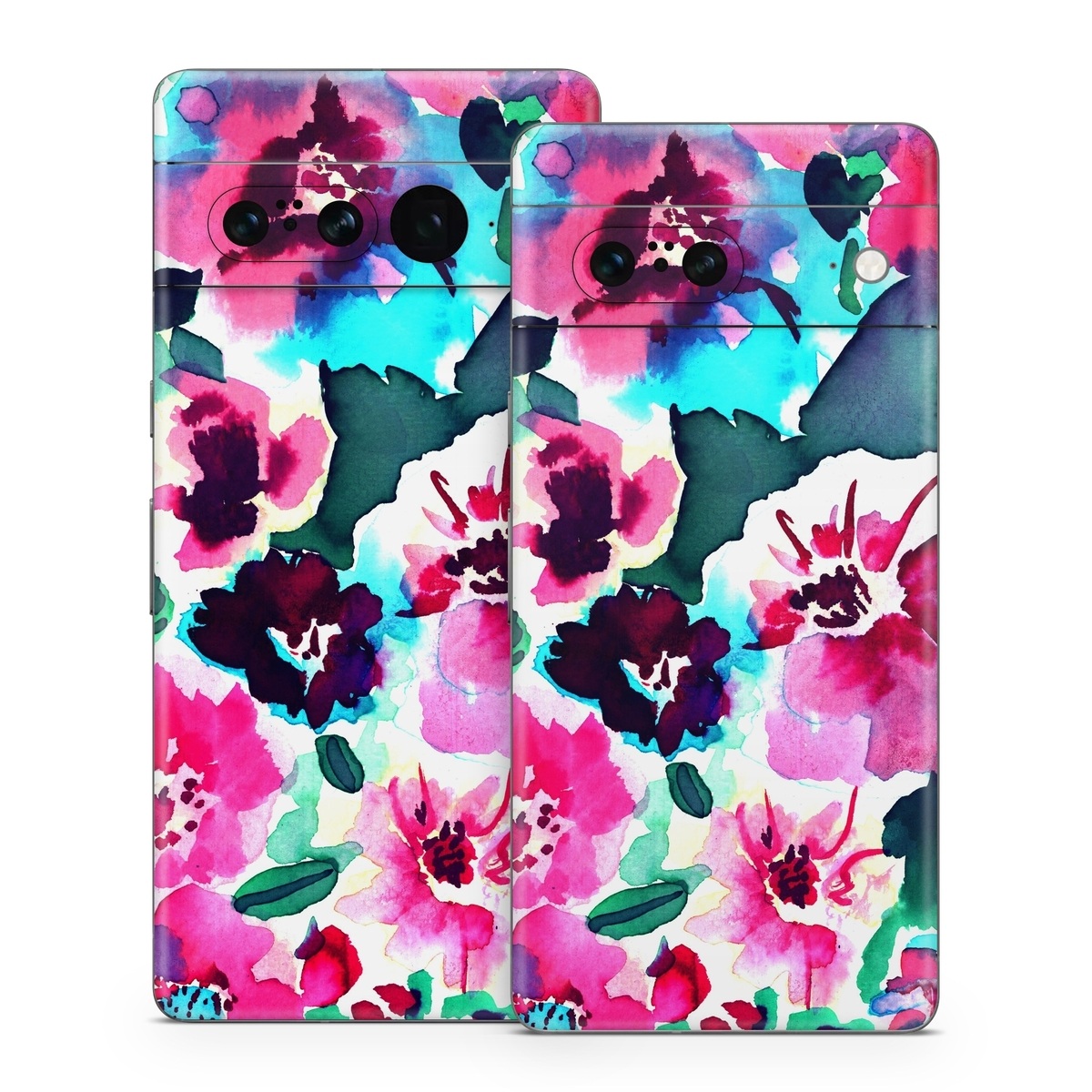 iStyles Google Pixel 7 Series Skin design of Flower, Pink, Petal, Plant, Pattern, Hawaiian hibiscus, Design, Magenta, Flowering plant, Watercolor paint, with white, pink, blue, green, red colors, and tagged with flowers, floral, flowers, nature, watercolor.
