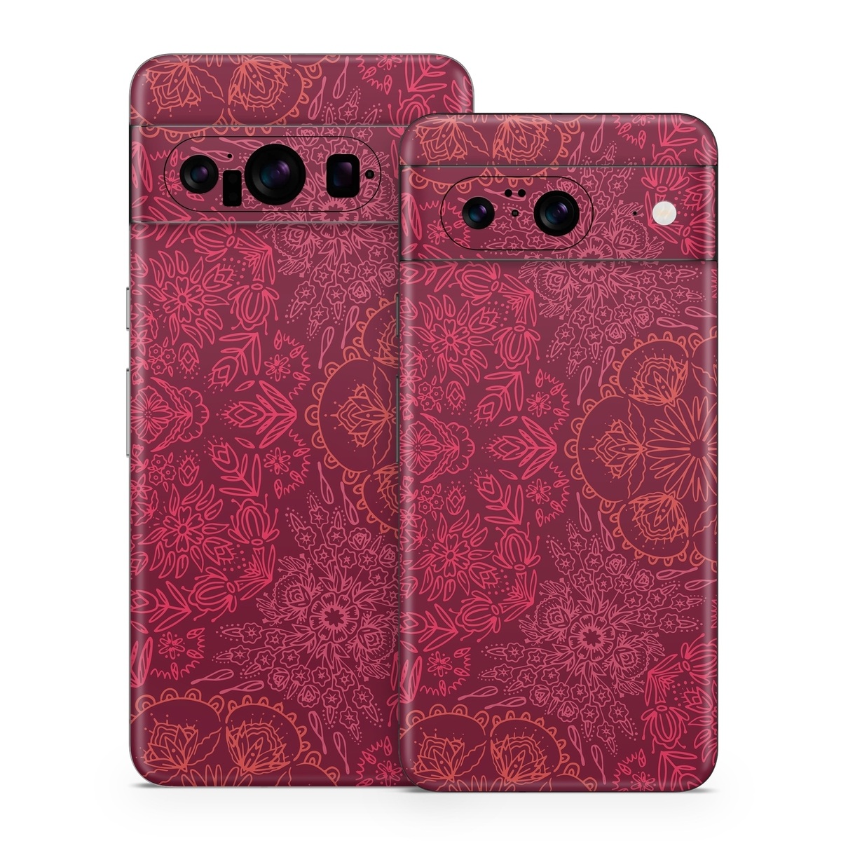 iStyles Google Pixel 8 Series Skin design of Red, Pattern, Pink, Magenta, Purple, Maroon, Violet, Textile, Design, Wallpaper, with red, black colors, and tagged with patterns, flowers, lookslike, floral, flowers, mandala, red, tapestry.
