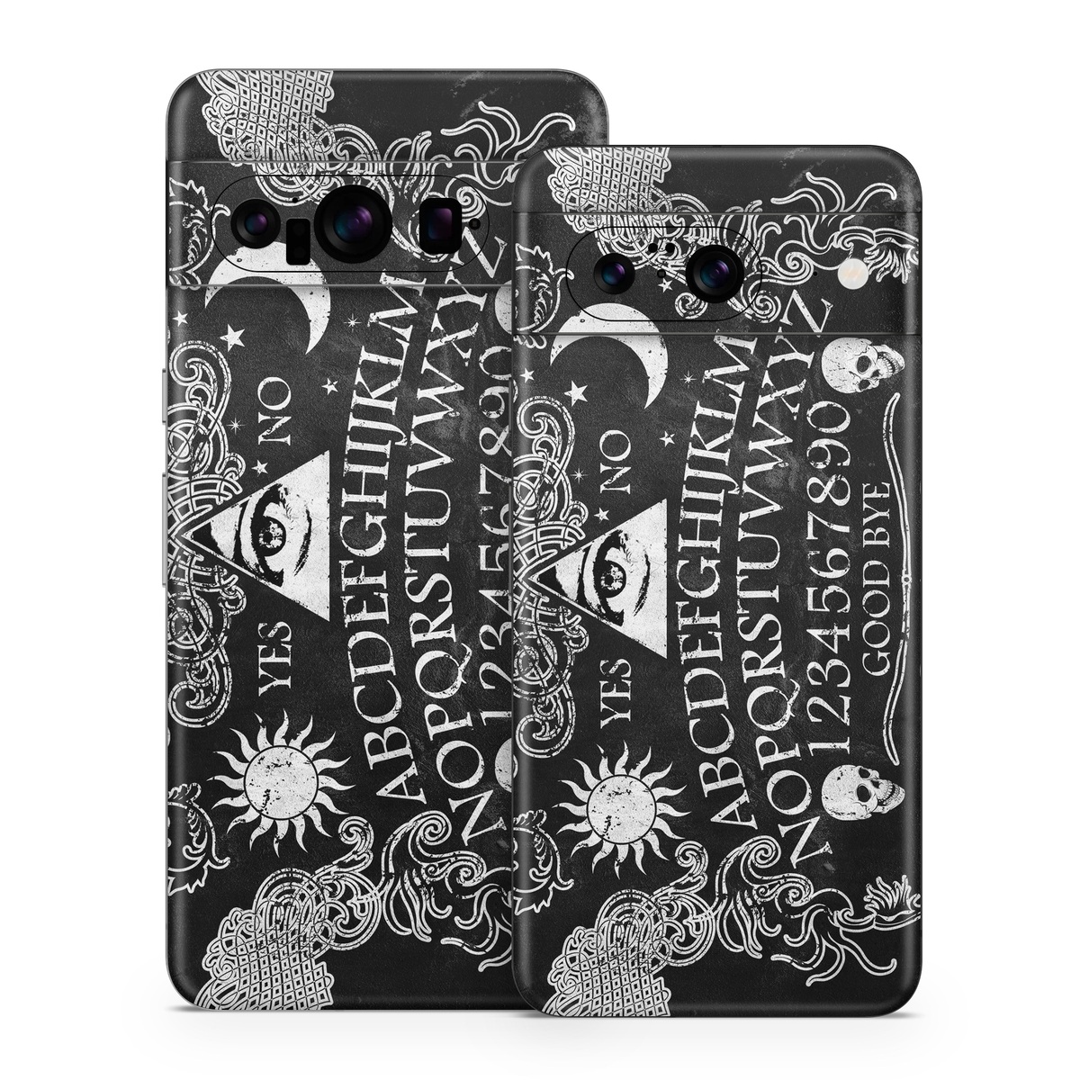 iStyles Google Pixel 8 Series Skin design of Text, Font, Pattern, Design, Illustration, Headpiece, Tiara, Black-and-white, Calligraphy, Hair accessory, with black, white, gray colors, and tagged with signs, skulls, black, demons, ghosts, magic, magick, paranormal, skull, spirit, talking.