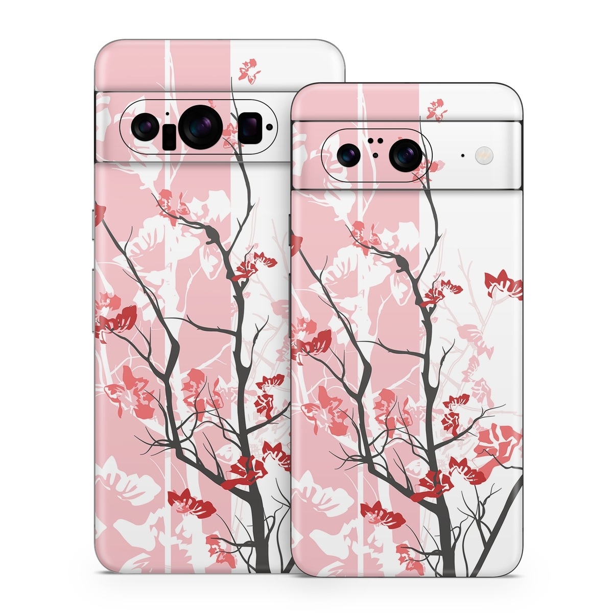 iStyles Google Pixel 8 Series Skin design of Branch, Red, Flower, Plant, Tree, Twig, Blossom, Botany, Pink, Spring, with white, pink, gray, red, black colors, and tagged with flowers.