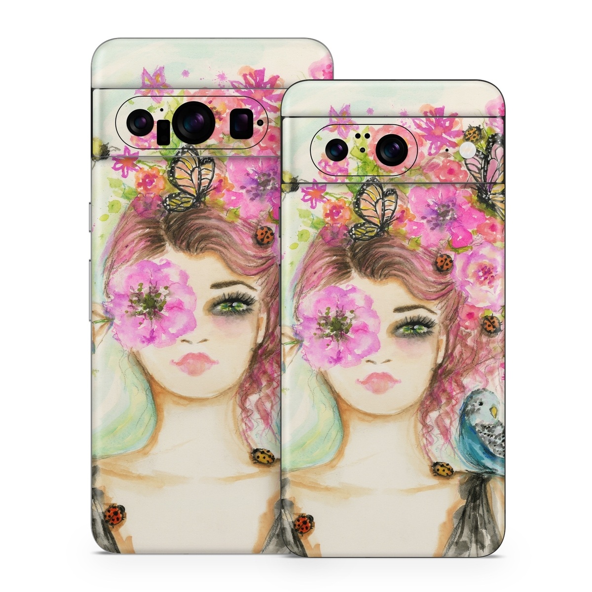 iStyles Google Pixel 8 Series Skin design of Face, Watercolor paint, Illustration, Pink, Head, Fashion illustration, Beauty, Art, Cheek, Painting, with white, pink, green, blue, yellow, red, brown colors, and tagged with people, fineart, objects, animals, flowers, nature, drawn, floral, flower, flowers, girl, handdrawn, nature, pastel, portrait, woman, bird, bee, butterfly.