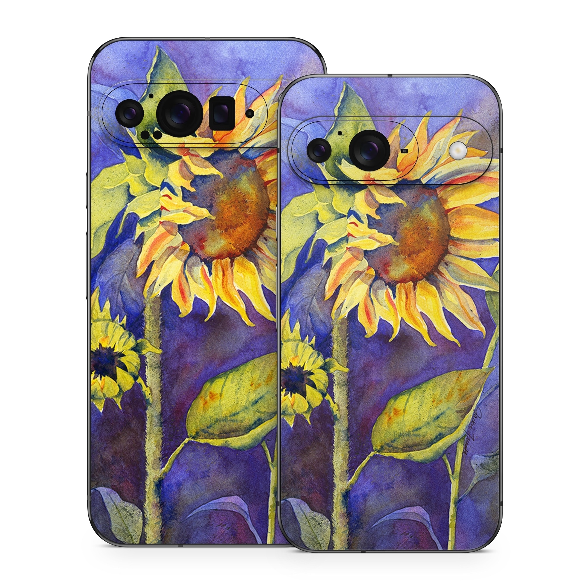 iStyles Google Pixel 9 Series Skin design of Flower, Sunflower, Painting, sunflower, Watercolor paint, Plant, Flowering plant, Yellow, Acrylic paint, Still life, with green, black, blue, gray, red, orange colors, and tagged with flowers, fineart.