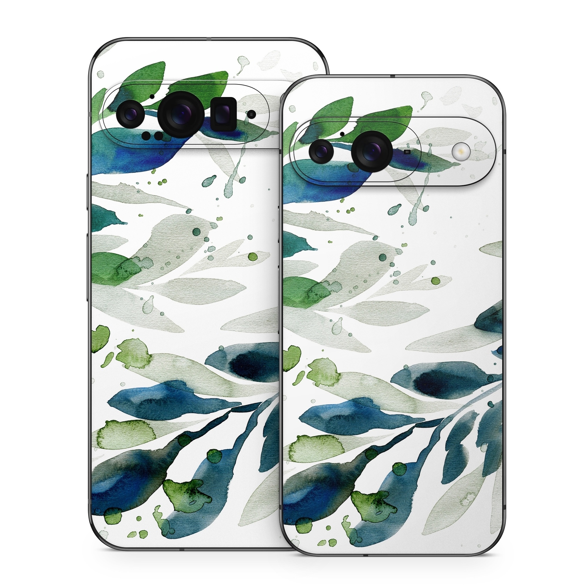 iStyles Google Pixel 9 Series Skin design of Leaf, Branch, Plant, Tree, Botany, Flower, Design, Eucalyptus, Pattern, Watercolor paint, with white, blue, green, gray colors, and tagged with nature, blue, filigree, green, leaf, leaves, nature, outdoors, pastel, watercolor.