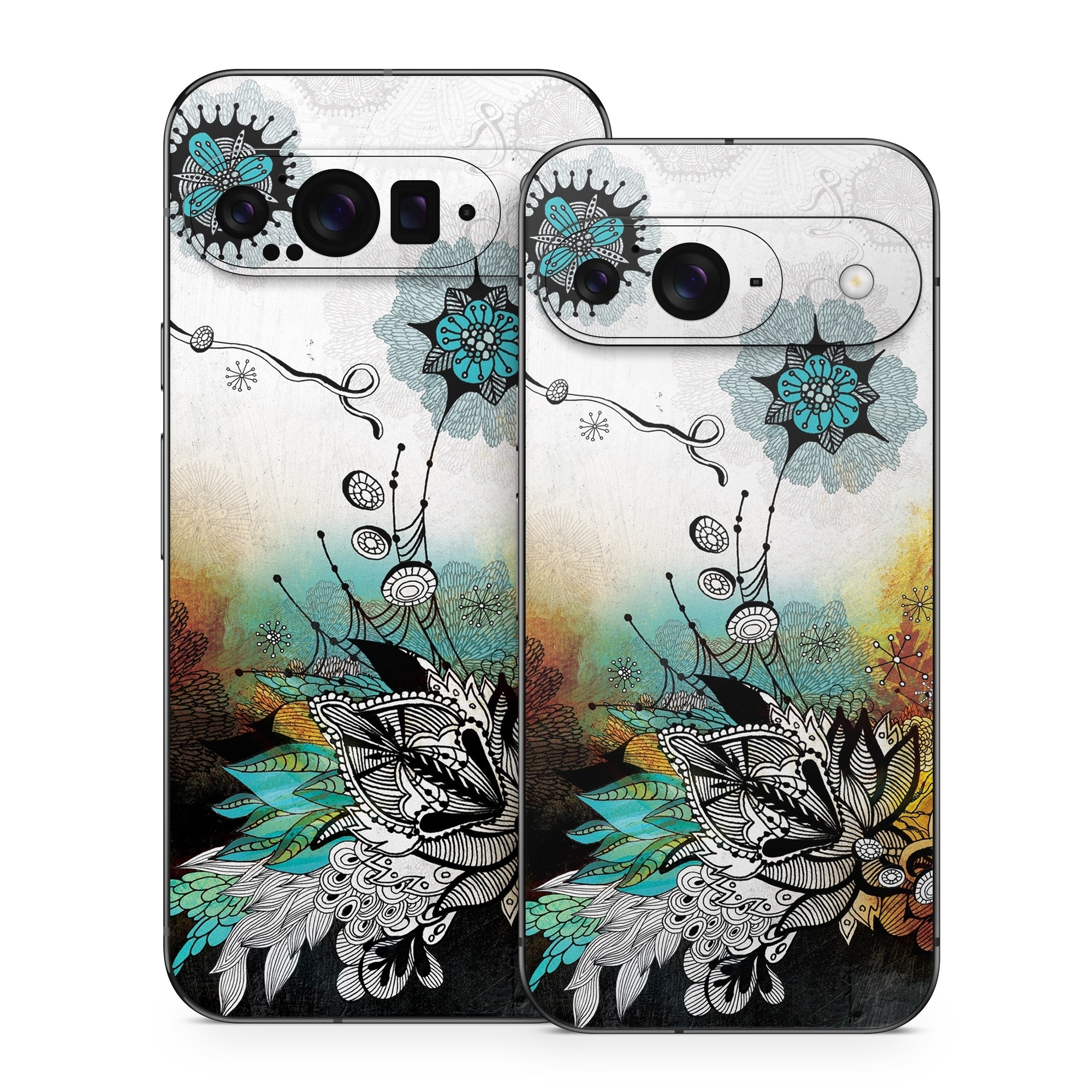 iStyles Google Pixel 9 Series Skin design of Graphic design, Illustration, Art, Design, Visual arts, Floral design, Font, Graphics, Modern art, Painting, with black, gray, red, green, blue colors, and tagged with abstract, flowers.