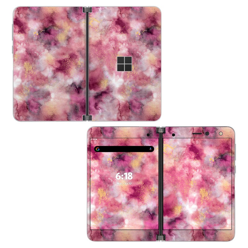 iStyles Microsoft Surface Duo Skin design of Purple, Pink, Magenta, Pattern, Plant, Art, Flower, Peach, Event, Petal, with white, black, red, purple, yellow, pink colors, and tagged with patterns, lookslike, marble, stone, red, white, pattern.