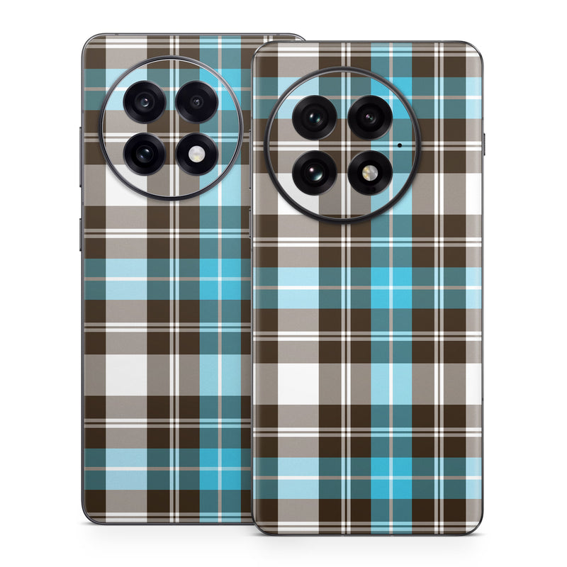 iStyles OnePlus 13 Series Skin design of Plaid, Pattern, Tartan, Turquoise, Textile, Design, Brown, Line, Tints and shades, with gray, black, blue, white colors, and tagged with patterns.