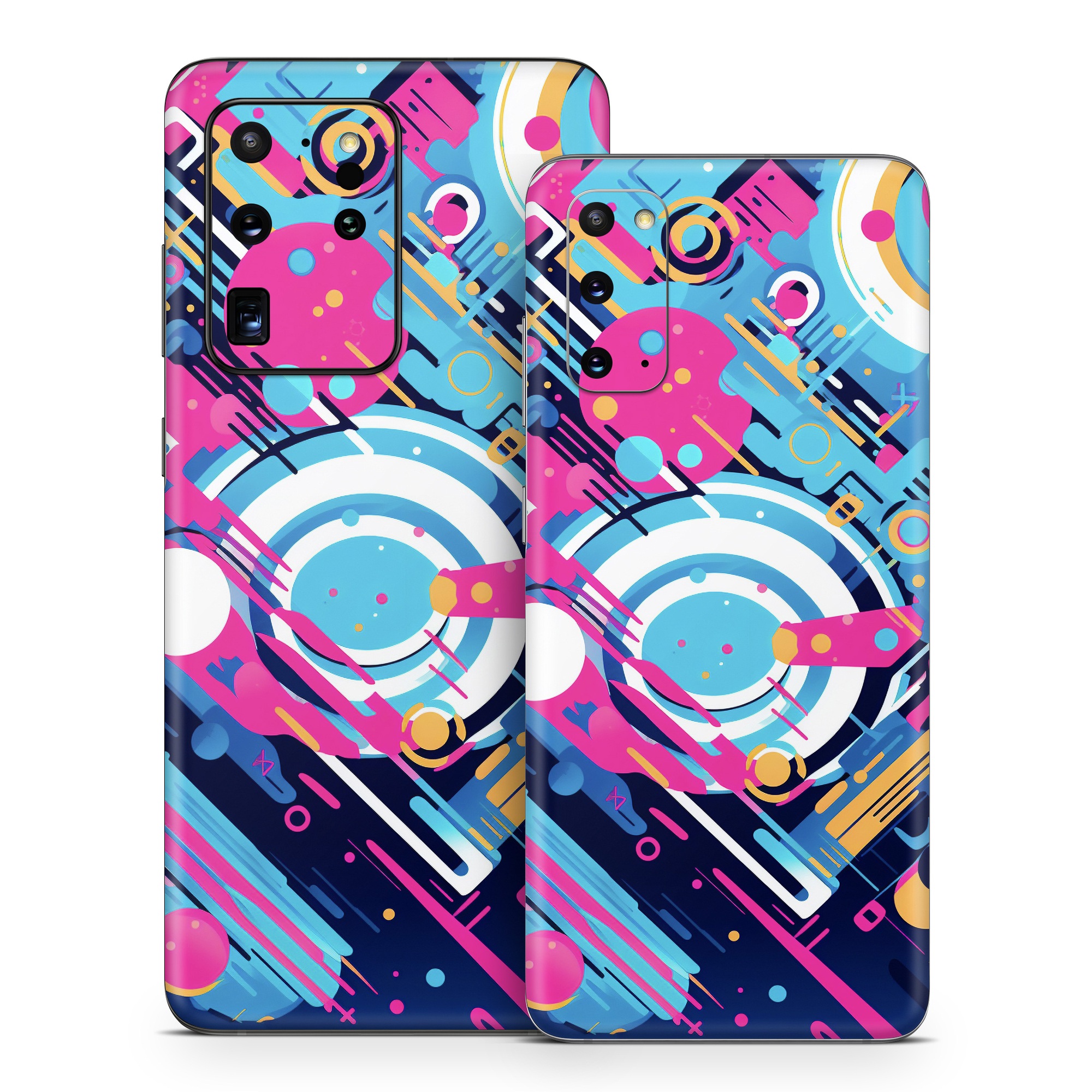 iStyles Samsung Galaxy S20 Series Skin design of Colorfulness, Font, Line, Material property, Art, Magenta, Pattern, Electric blue, Circle, Graphics, with blue, pink, black, white, orange colors, and tagged with abstract, abstract, circles, lines, dripping.
