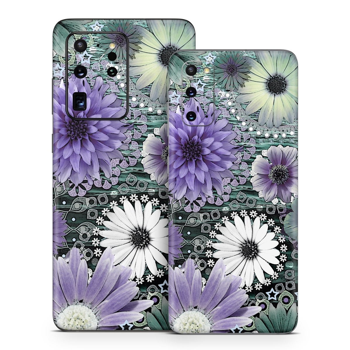 iStyles Samsung Galaxy S20 Series Skin design of Purple, Flower, african daisy, Pericallis, Plant, Violet, Lavender, Botany, Petal, Pattern, with gray, black, blue, purple, white colors, and tagged with flowers.