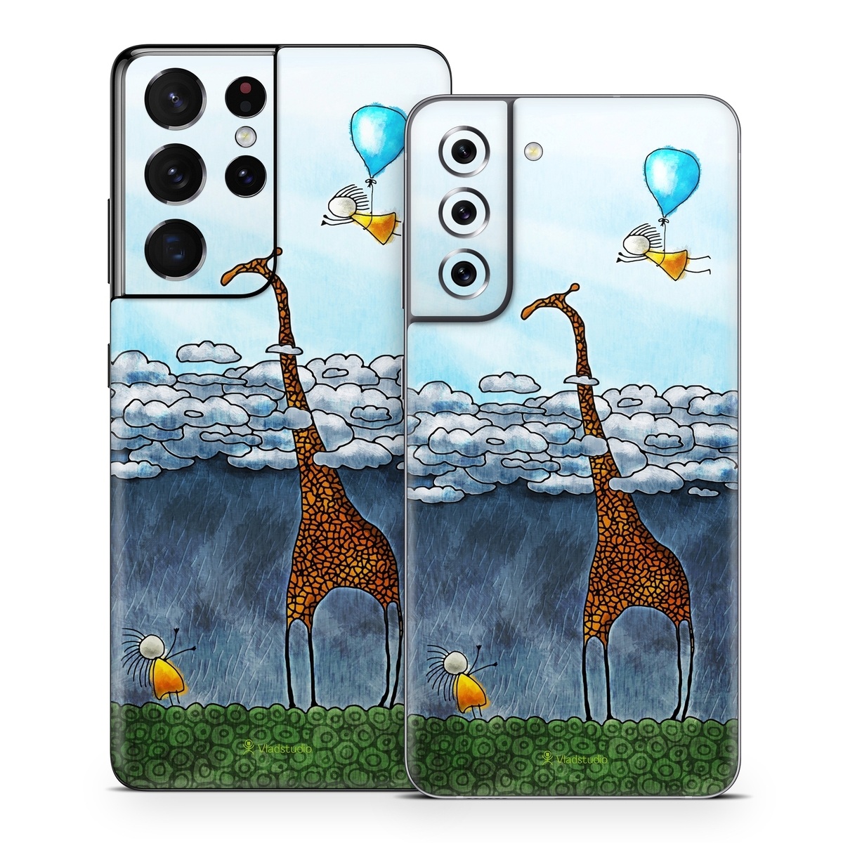 iStyles Samsung Galaxy S21 Series Skin design of Giraffe, Sky, Tree, Water, Branch, Giraffidae, Illustration, Cloud, Grassland, Bird, with blue, gray, yellow, green colors, and tagged with animals, nature, objects.
