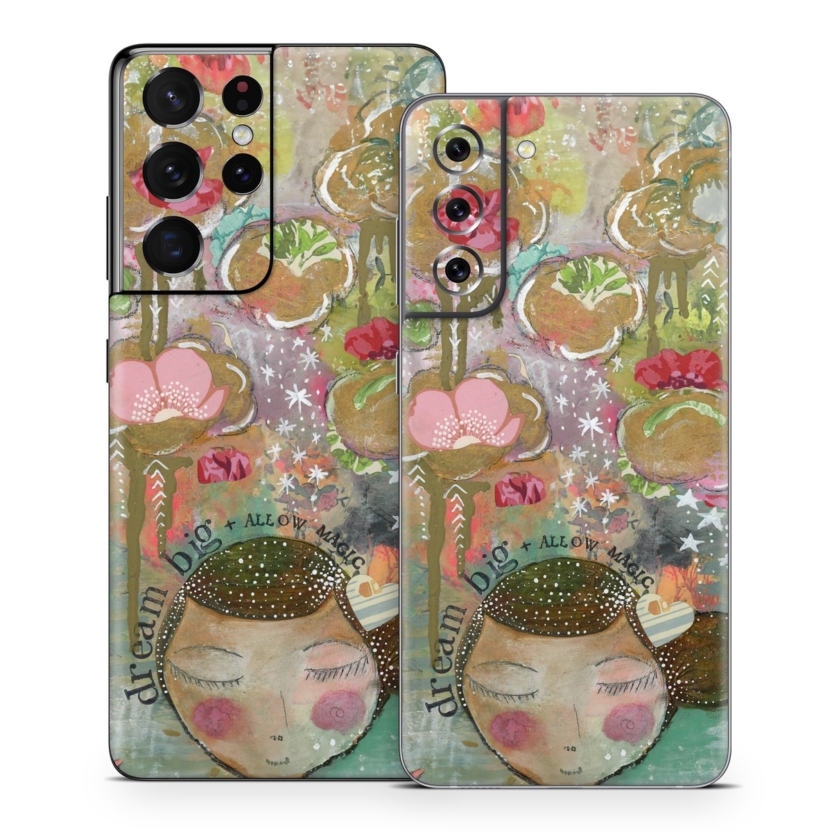iStyles Samsung Galaxy S21 Series Skin design of Painting, Pink, Illustration, Art, Child art, Watercolor paint, Drawing, Visual arts, Still life, with brown, pink, red, green, white, black, orange, gray colors, and tagged with flowers, signs, people, dream, flowers, magic, nature, painting.
