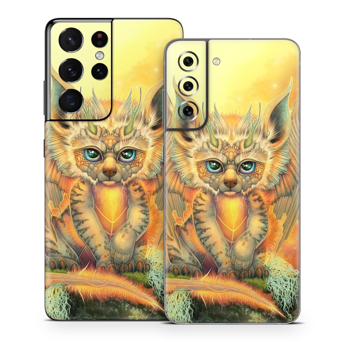 iStyles Samsung Galaxy S21 Series Skin design of Nature, Mammal, Art, Fawn, Owl, Illustration, Tail, Fictional character, Visual arts, Terrestrial animal, with yellow, orange, green, white, black colors, and tagged with fantasy, animals, nature, tiger, stripes, wings, horns, yellow, leaves.