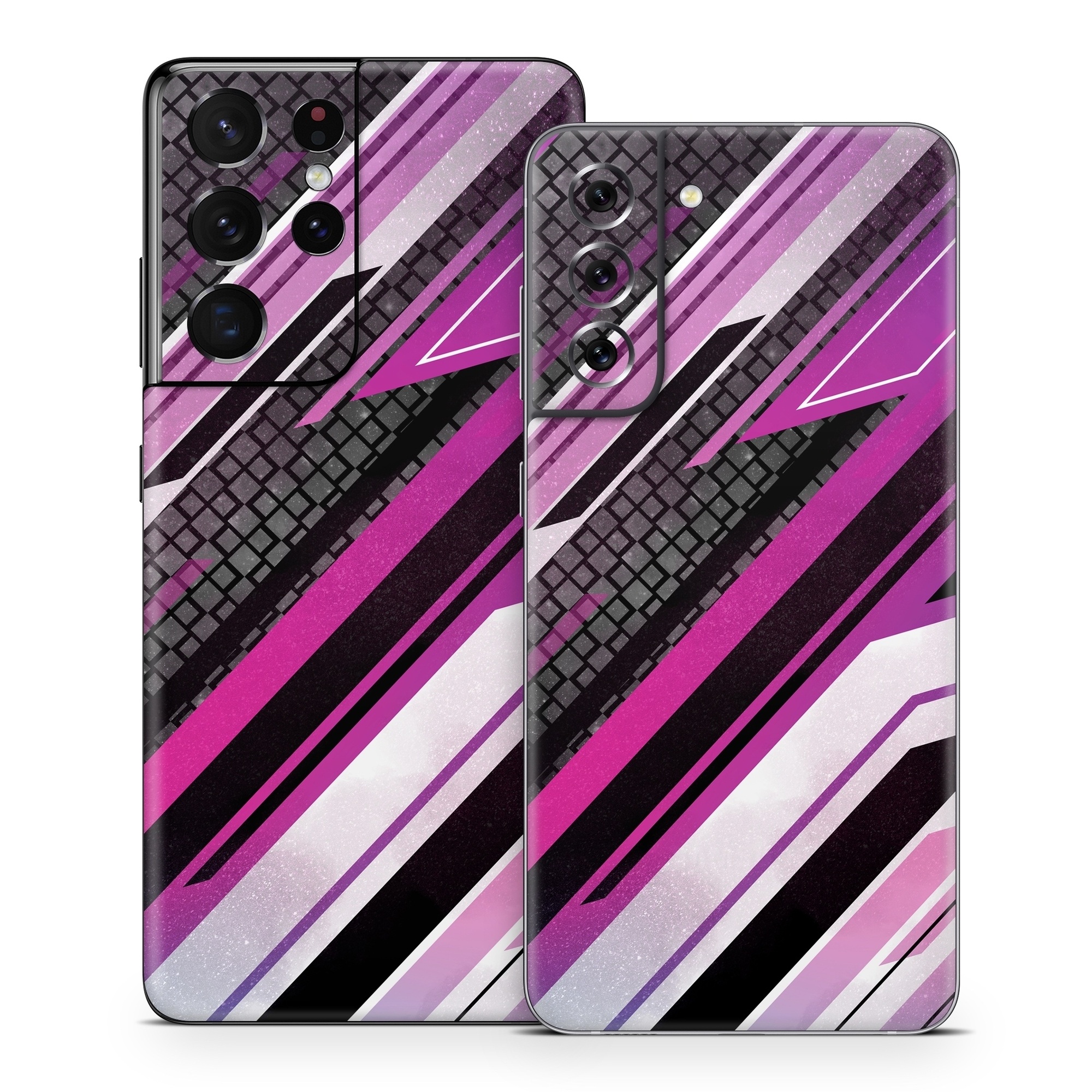 iStyles Samsung Galaxy S21 Series Skin design of Automotive lighting, Hood, Grille, Purple, Automotive design, Automotive exterior, Violet, Motor vehicle, Pink, Line, with black, purple, white, gray, pink colors, and tagged with patterns, patterns, lines, shapes.