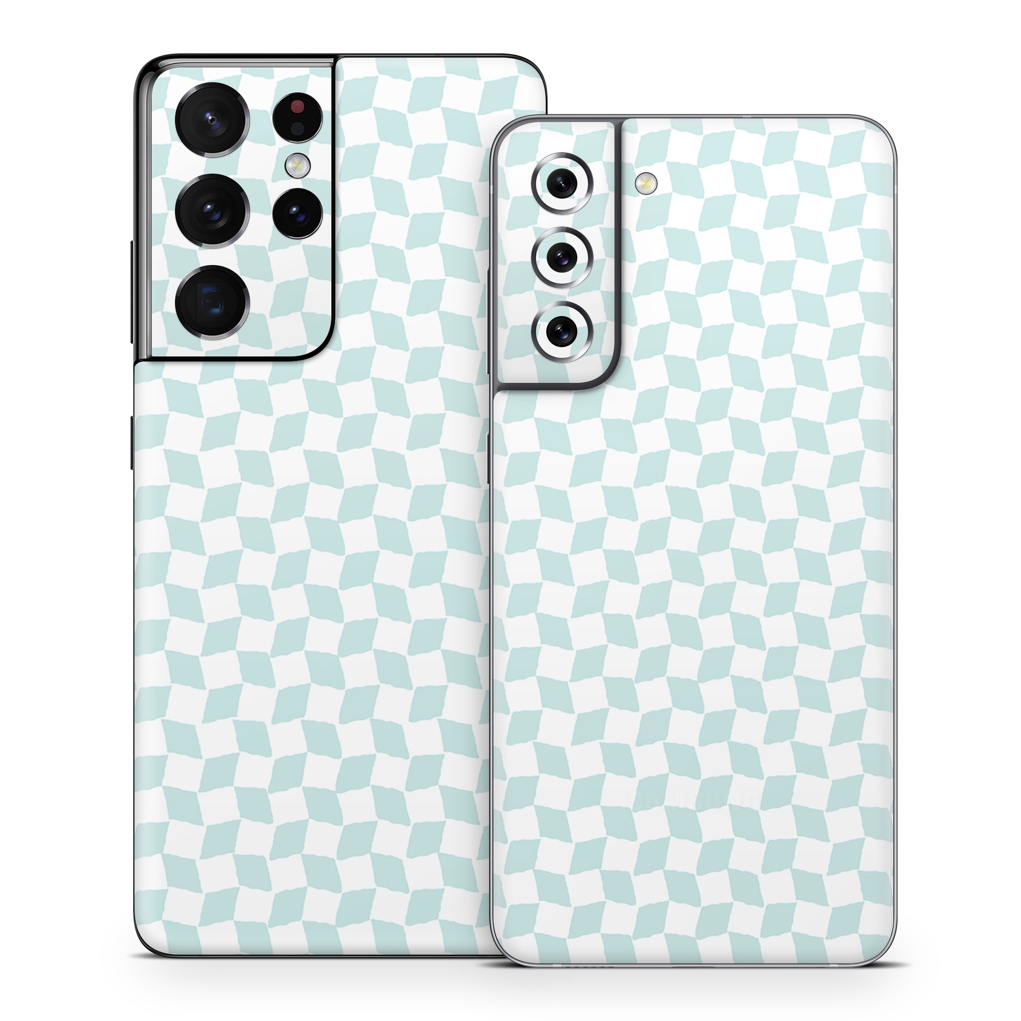 iStyles Samsung Galaxy S21 Series Skin design of Blue, Azure, Art, Font, Aqua, Rectangle, Floor, Flooring, Material property, Symmetry, with white, blue colors, and tagged with patterns, checkered, pattern.