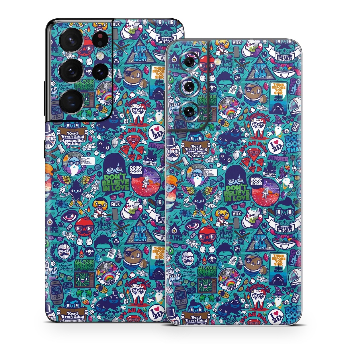 iStyles Samsung Galaxy S21 Series Skin design of Art, Visual arts, Illustration, Graphic design, Psychedelic art, with blue, black, gray, red, green colors, and tagged with abstract, space, hearts.