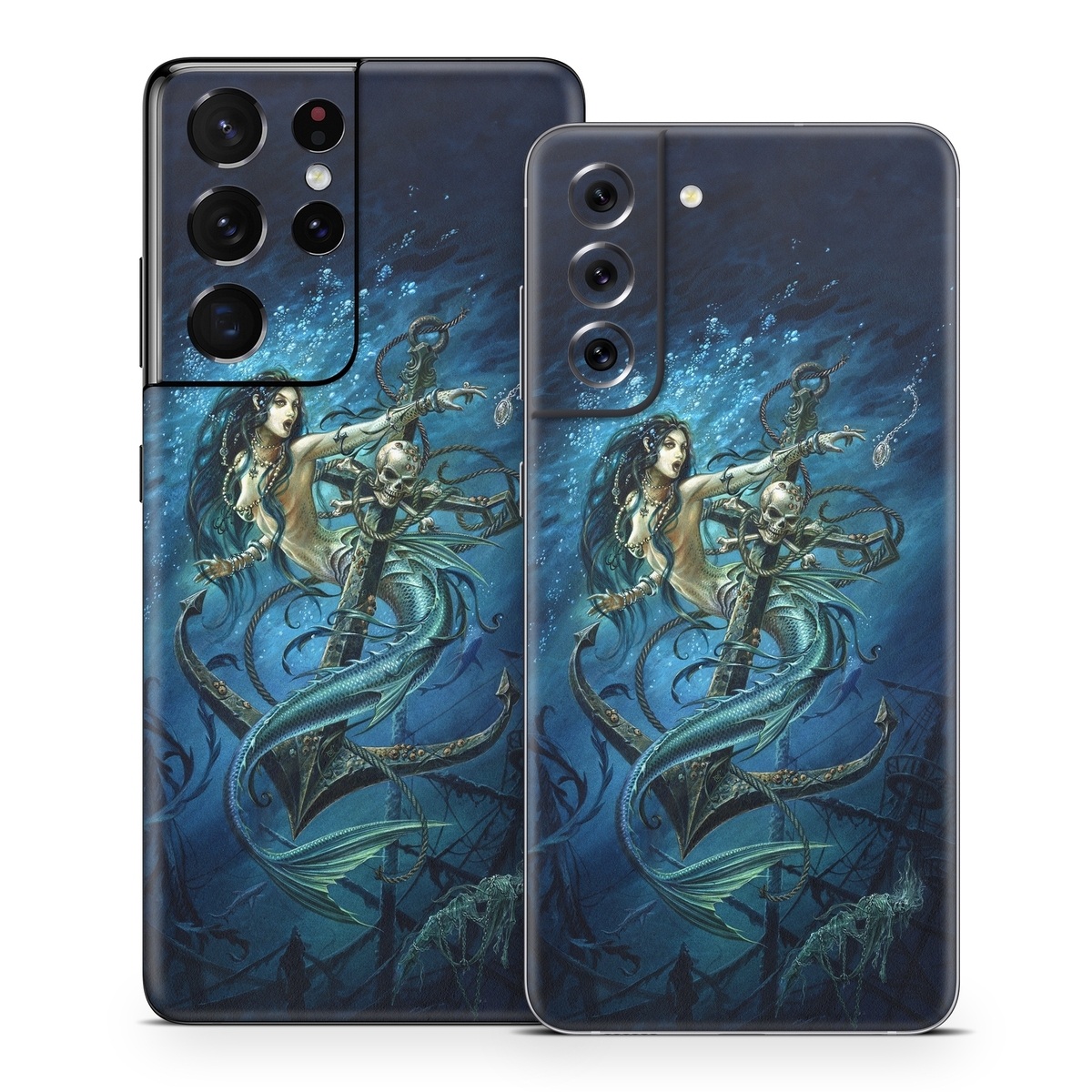 iStyles Samsung Galaxy S21 Series Skin design of Mermaid, Cg artwork, Illustration, Fictional character, Art, Mythology, Mythical creature, Graphic design, with blue, green, white, black colors, and tagged with skulls, people, fantasy, animals.
