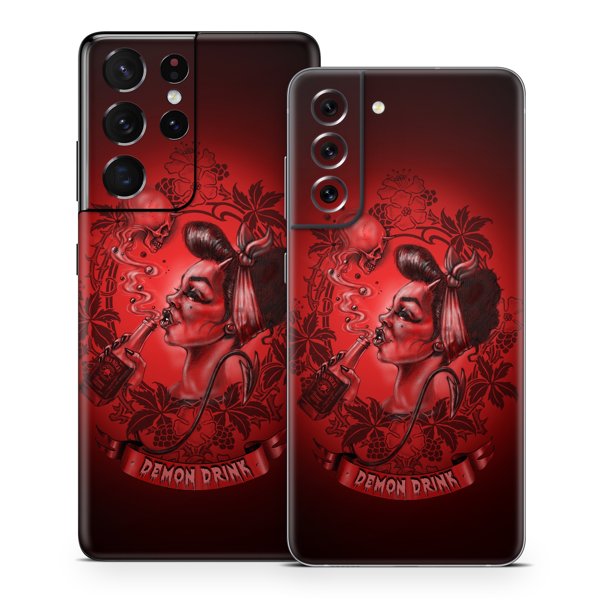 iStyles Samsung Galaxy S21 Series Skin design of Font, Art, Magenta, Pattern, Graphics, Visual arts, Painting, Carmine, Illustration, Drawing, with black, red, white colors, and tagged with skulls, signs, people, objects, fantasy, addiction, alcohol, bottle.