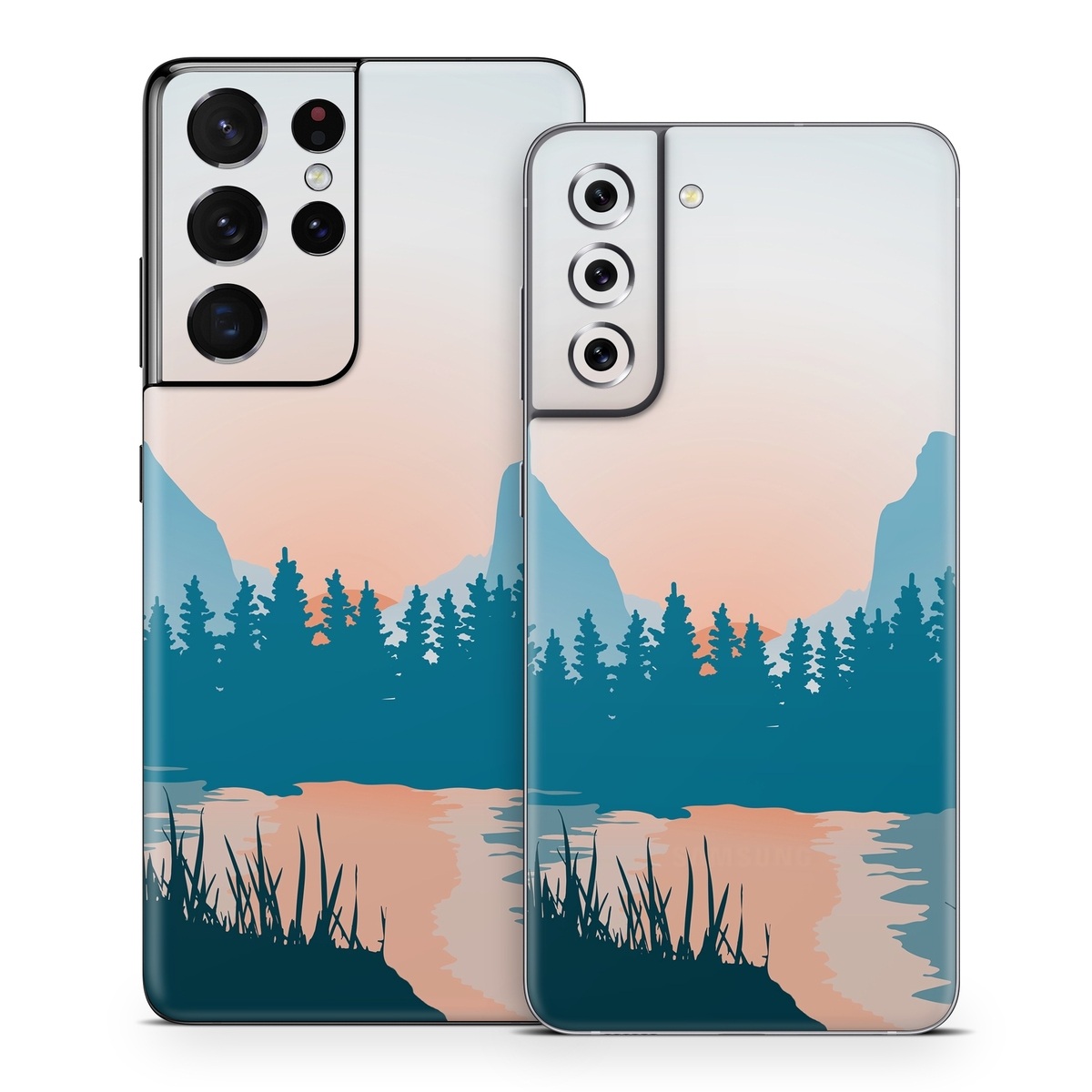 iStyles Samsung Galaxy S21 Series Skin design of Sky, Atmosphere, Mountain, Ecoregion, Plant, Natural landscape, Larch, Highland, Fog, Atmospheric phenomenon, with blue, yellow, orange, green colors, and tagged with nature, sunset, mountain, forest, landscape, grass.