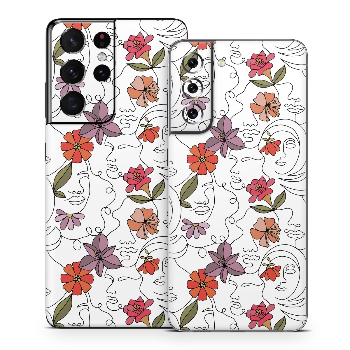 iStyles Samsung Galaxy S21 Series Skin design of Flower, Plant, White, Product, Petal, Branch, Rectangle, Botany, Textile, Creative arts, with white, red, purple, green, orange colors, and tagged with patterns, flowers, people, drawing, flowers, outline, pattern, women.