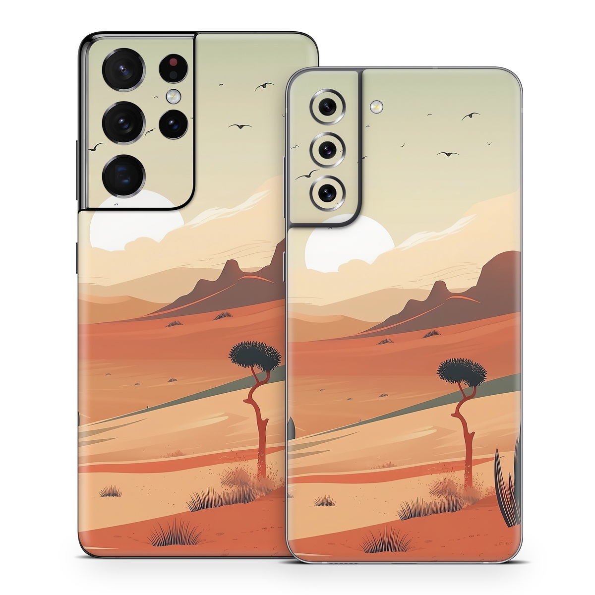 iStyles Samsung Galaxy S21 Series Skin design of Sky, Bird, Ecoregion, Light, Nature, Cloud, Natural environment, Moon, Natural landscape, Biome, with orange, yellow, brown, green, white, black colors, and tagged with nature, animals, desert, landscape, distance, birds, sunset, sand.