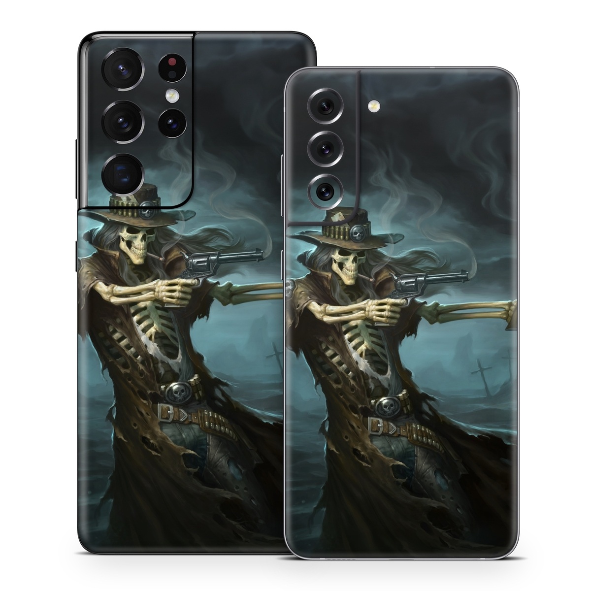 iStyles Samsung Galaxy S21 Series Skin design of Cg artwork, Action-adventure game, Darkness, Illustration, Games, Adventure game, Pc game, Woman warrior, Digital compositing, Fictional character, with black, white, blue, gray colors, and tagged with fantasy, skulls, people, bullets, fantasy, gaming, guns, skeleton, skull.