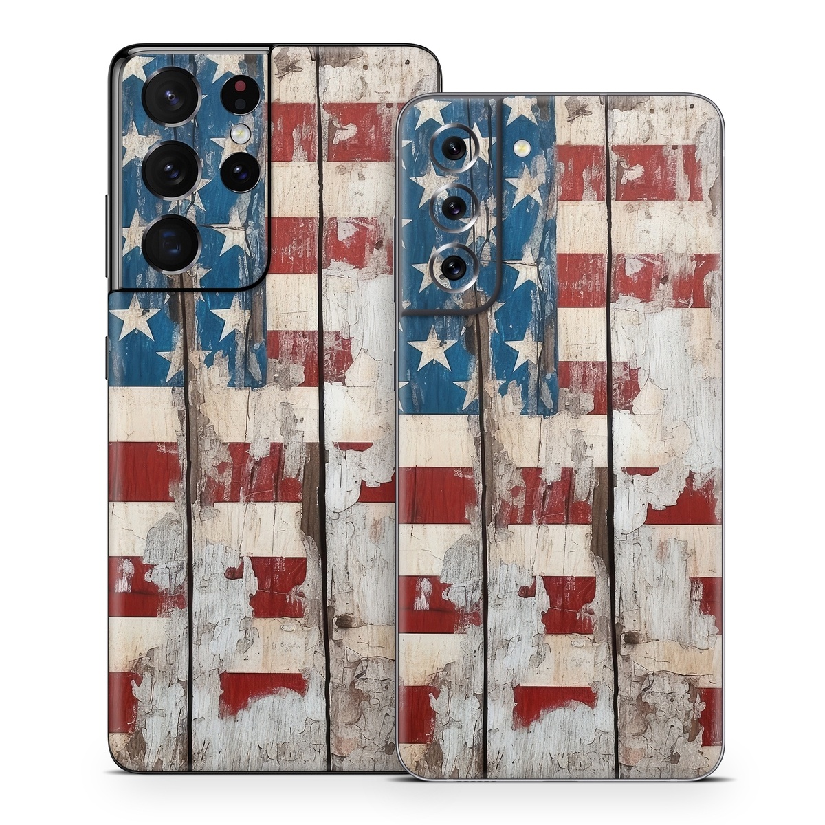 iStyles Samsung Galaxy S21 Series Skin design of Flag of the united states, World, Rectangle, Textile, Line, Wall, Flag, Symmetry, Tints and shades, Pattern, with red, blue, white, brown, gray, black colors, and tagged with flags, patterns, signs, united, states, flag, wooden, panels, stars, stripes, worn.