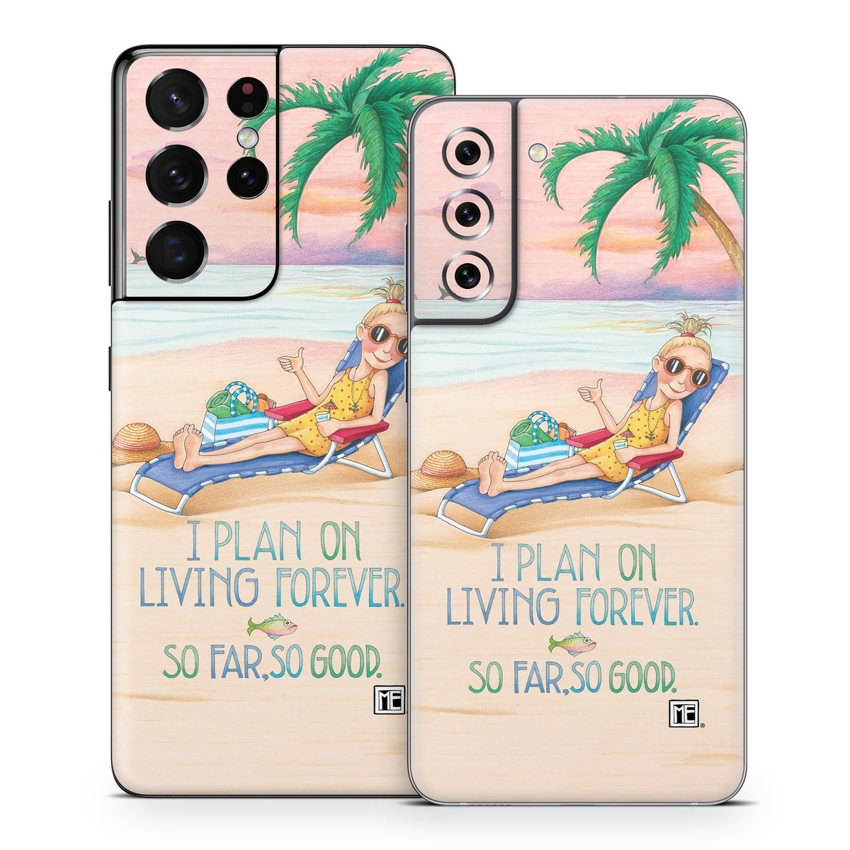 iStyles Samsung Galaxy S21 Series Skin design of Vacation, Product, Summer, Aqua, Illustration, Sun tanning, Fictional character, Caribbean, Graphics, Happy, with pink, green, brown, yellow, blue, white, red colors, and tagged with signs, people, animals, beach, humor, ocean, palmtree.