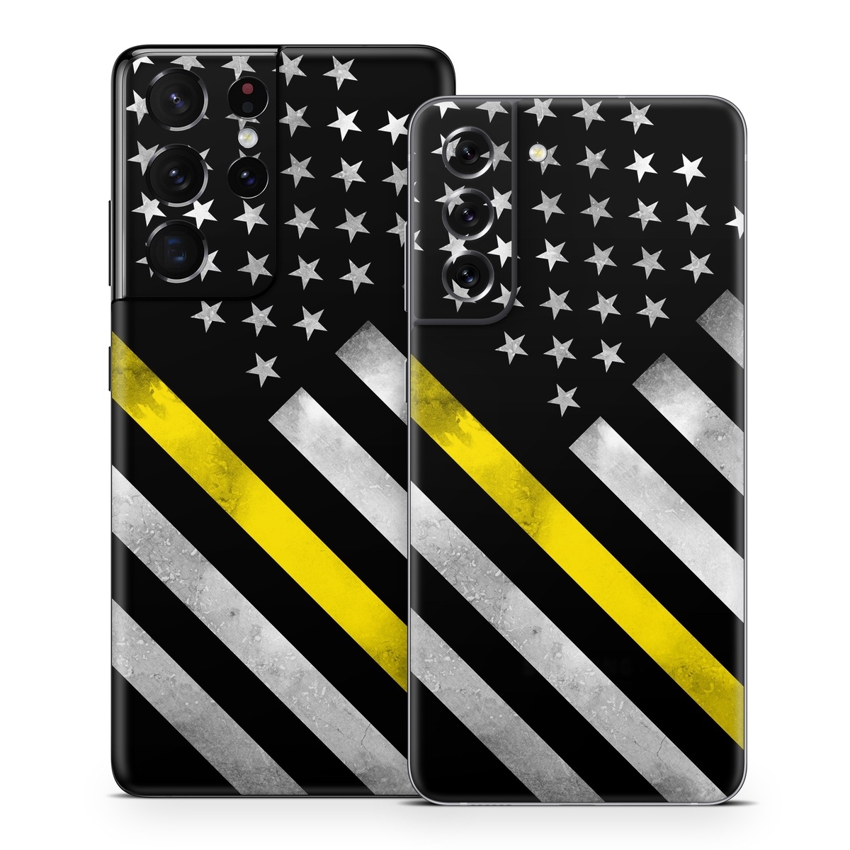 iStyles Samsung Galaxy S21 Series Skin design of Flag of the united states, Flag, Yellow, Line, Black-and-white, Pattern, Monochrome, Graphic design, Parallel, with black, white, gray, yellow colors, and tagged with flags, signs, ems, fire, firstresponder, flag, police, rescue, thinline.