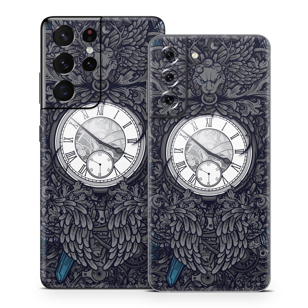 iStyles Samsung Galaxy S21 Series Skin design of Blue, Pattern, Psychedelic art, Design, Circle, Art, Font, Graphic design, Visual arts, Illustration, with black, gray colors, and tagged with objects, patterns, animals, grandfather, clock, clocks, alarm, time, antique, table.