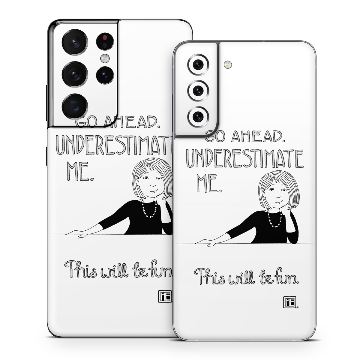 iStyles Samsung Galaxy S21 Series Skin design of Gesture, Happy, Font, Illustration, Poster, Line art, Graphics, Art, Logo, Graphic design, with black, white colors, and tagged with signs, people, confidence, attitude, go, ahead, underestimate, me, this, will, be, fun.