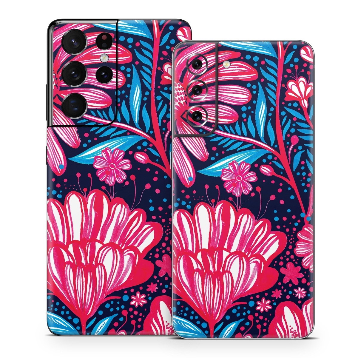 iStyles Samsung Galaxy S21 Series Skin design of Pattern, Red, Pink, Floral design, Textile, Design, Flower, Plant, Petal, with black, white, red, blue, pink colors, and tagged with flowers, blue, bright, colorful, flowers, red, white.