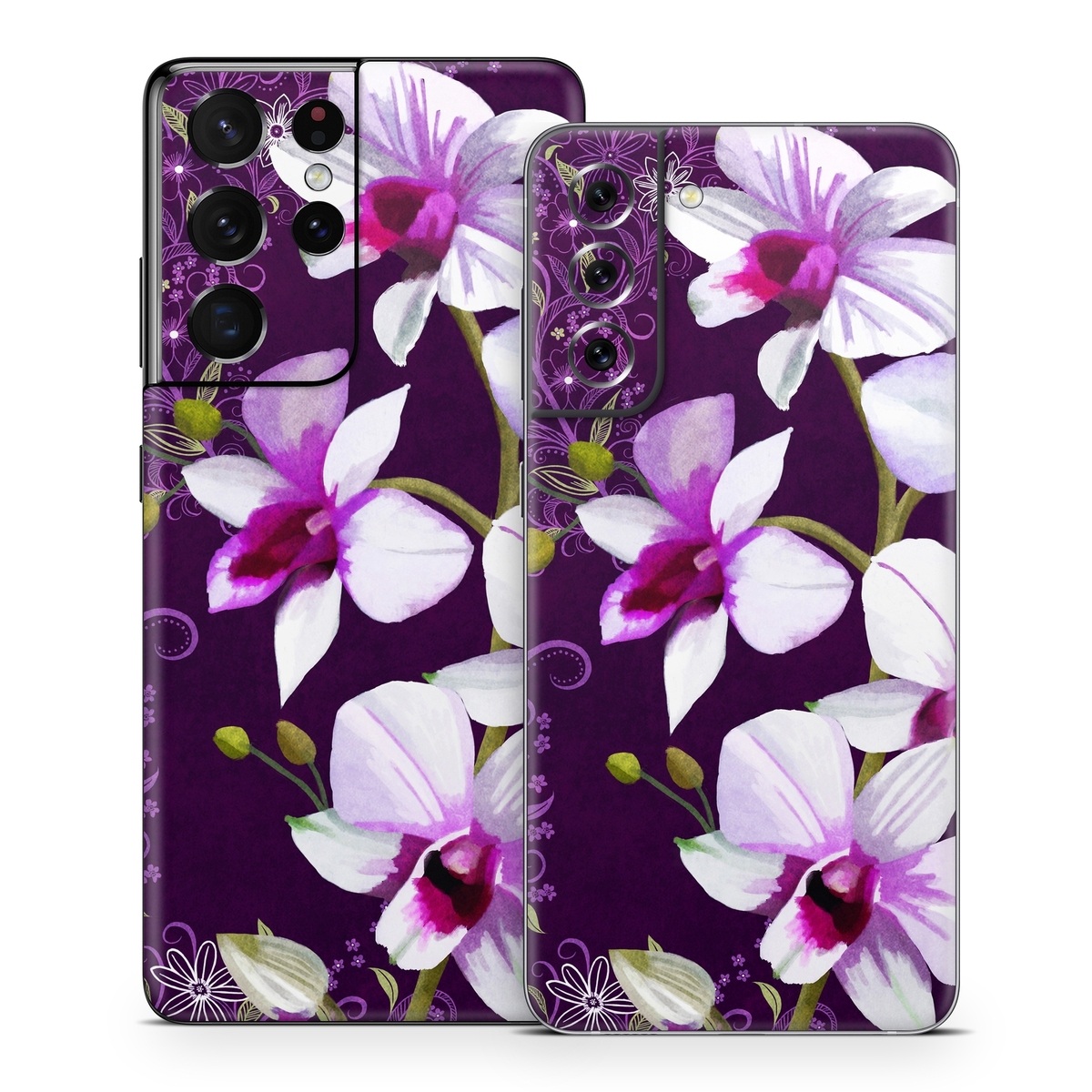iStyles Samsung Galaxy S21 Series Skin design of Flower, Purple, Petal, Violet, Lilac, Plant, Flowering plant, cooktown orchid, Botany, Wildflower, with black, gray, white, purple, pink colors, and tagged with flowers, abstract.