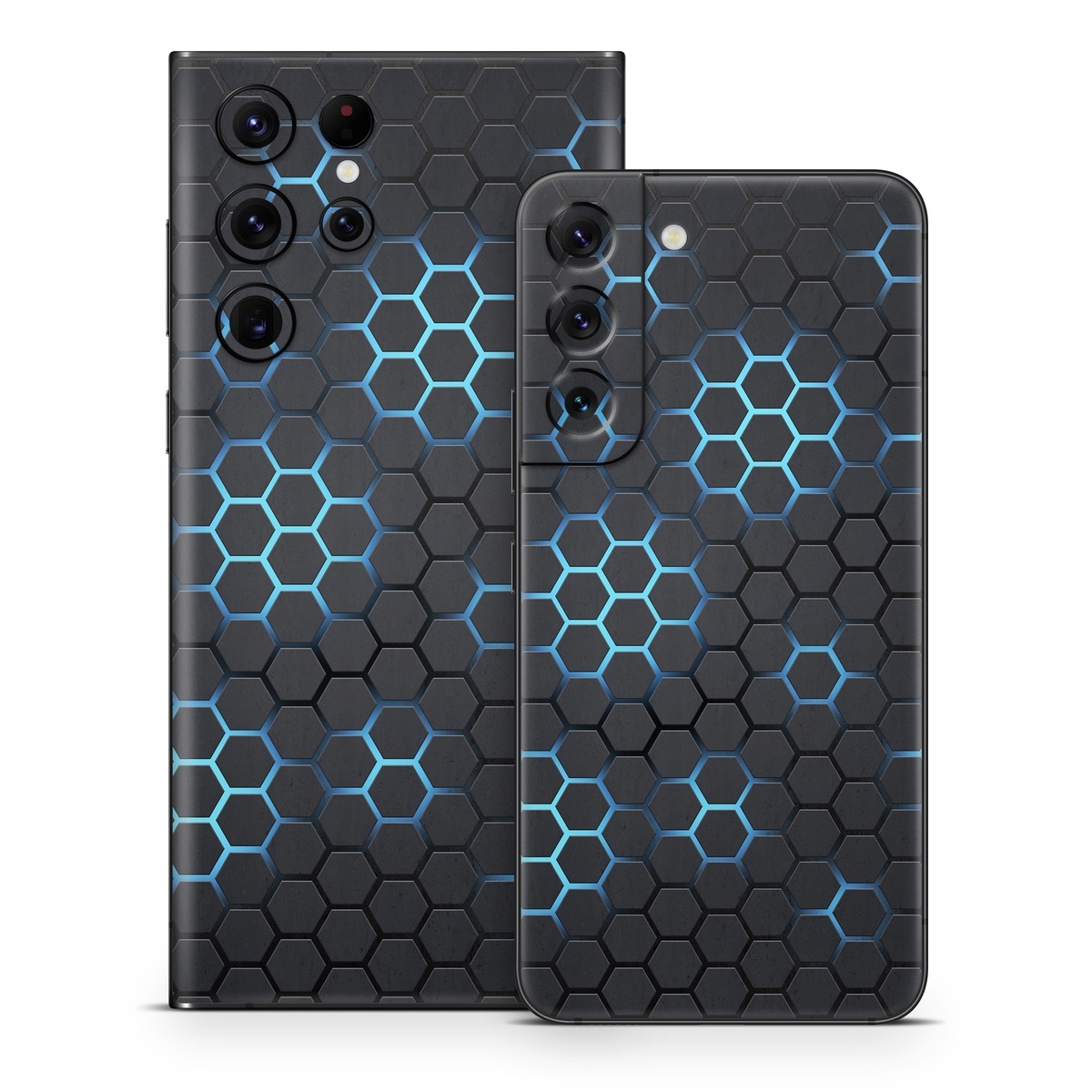 iStyles Samsung Galaxy S22 Series Skin design of Pattern, Water, Design, Circle, Metal, Mesh, Sphere, Symmetry, with black, gray, blue colors, and tagged with lookslike, fantasy, space, drones, geometric, hexagon, tech.