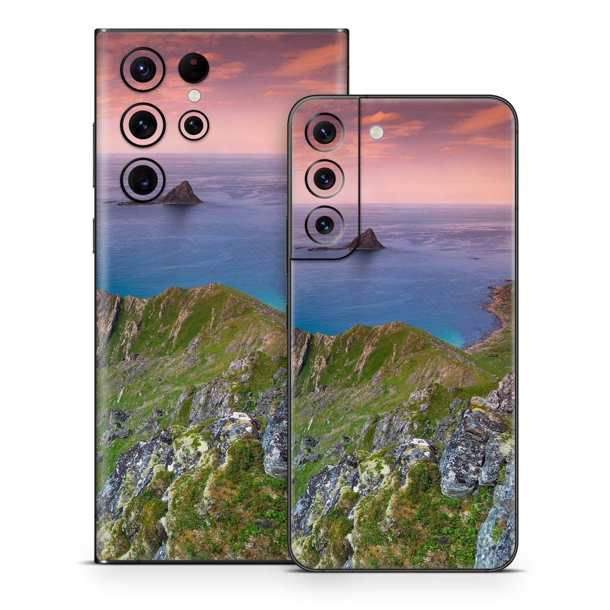 iStyles Samsung Galaxy S22 Series Skin design of Body of water, Nature, Sky, Coast, Sea, Headland, Natural landscape, Promontory, Coastal and oceanic landforms, Cliff, with red, orange, green, blue, yellow colors, and tagged with nature, photos, landscape, mountains, ocean, photo, photography, sunset.