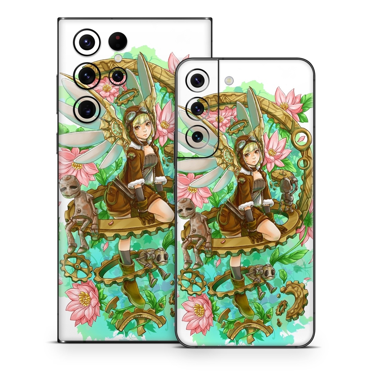 iStyles Samsung Galaxy S22 Series Skin design of Illustration, Fictional character, Clip art, Art, Graphics, Plant, with white, yellow, pink, green, brown, black colors, and tagged with people, fineart, fantasy, flowers, objects, angel, flowers, gear, gears, girl, pinup, pinupgirl, punk, steampunk, tinker.