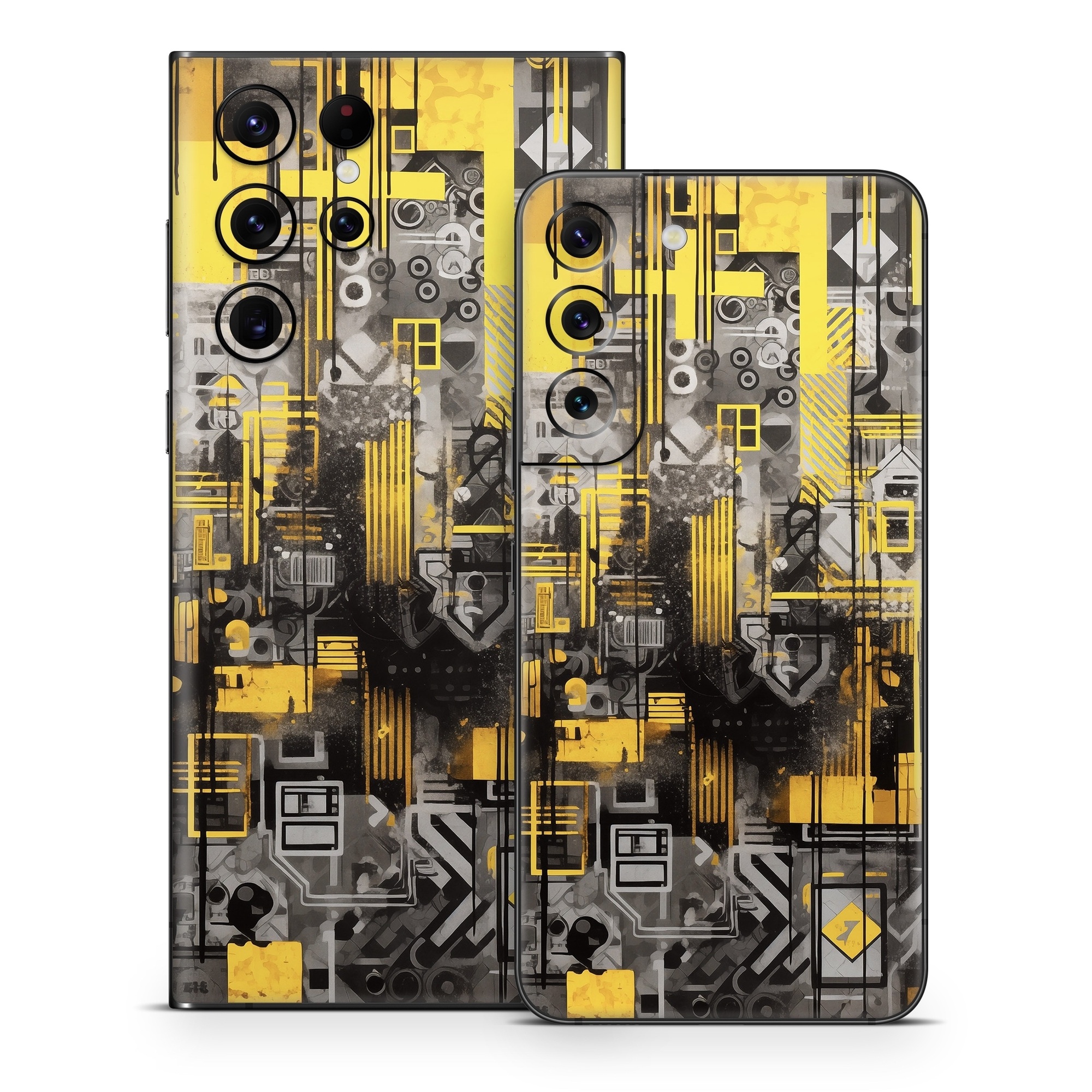 iStyles Samsung Galaxy S22 Series Skin design of Rectangle, Yellow, Font, Art, City, Engineering, Tints and shades, Pattern, Symmetry, Space, with black, white, gray, yellow colors, and tagged with abstract, confusion, work.