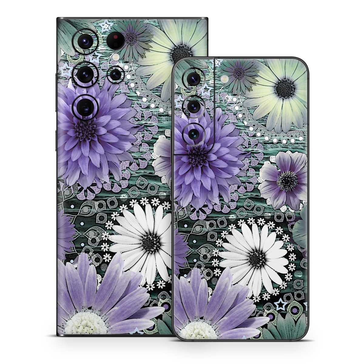 iStyles Samsung Galaxy S22 Series Skin design of Purple, Flower, african daisy, Pericallis, Plant, Violet, Lavender, Botany, Petal, Pattern, with gray, black, blue, purple, white colors, and tagged with flowers.