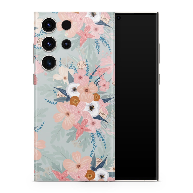 iStyles Samsung Galaxy S23 Series Skin design of Pattern, Aqua, Wrapping paper, Textile, Design, Floral design, Wildflower, Plant, Pedicel, Blossom, with pink, red, blue, white colors, and tagged with patterns, flowers, florals, flowers, garden, green, pastelcolors, pink.