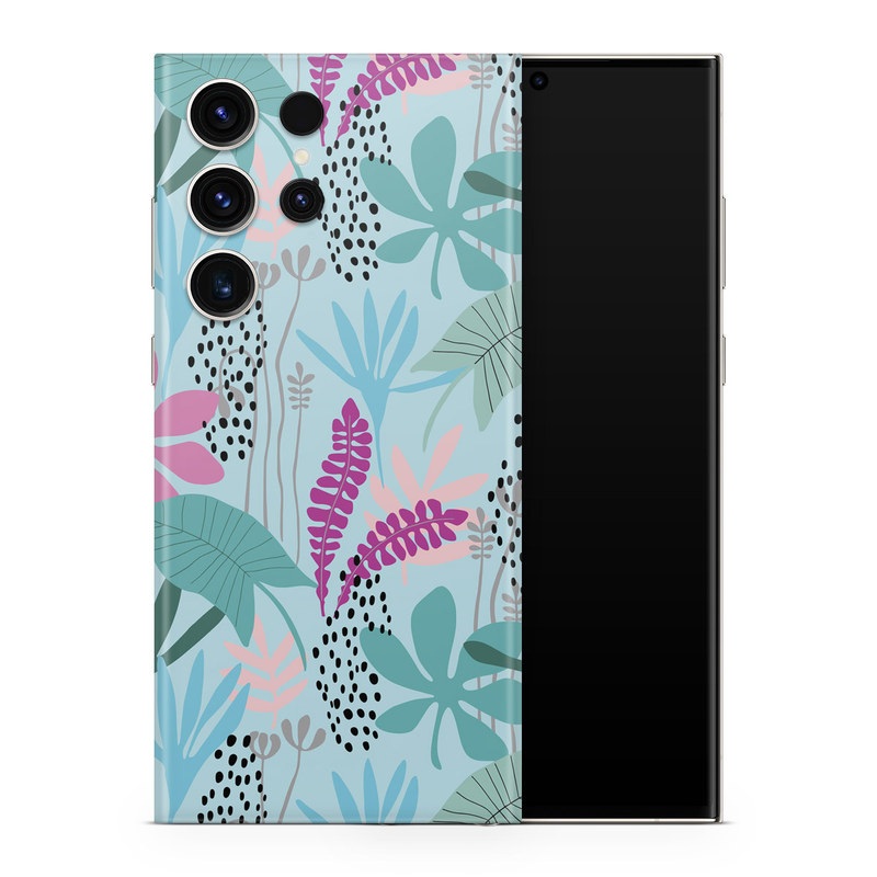 iStyles Samsung Galaxy S23 Series Skin design of White, Leaf, Botany, Green, Textile, Branch, Organism, Plant, Font, Pink, with blue, green, pink, purple, black, gray colors, and tagged with patterns, flowers, nature, flowers, leaves, nature.