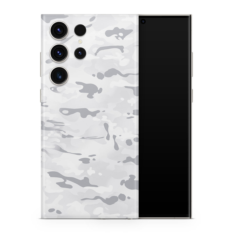 iStyles Samsung Galaxy S23 Series Skin design of Vertebrate, Mammal, Grey, Pattern, Monochrome, Art, Monochrome photography, Rock, Font, Winter, with white, gray colors, and tagged with military, patterns, snow, camouflage, mountain, white.