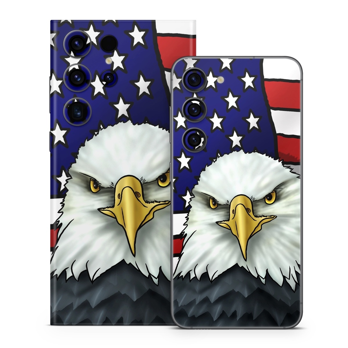 iStyles Samsung Galaxy S23 Series Skin design of Bald eagle, Eagle, Bird, Bird of prey, Accipitridae, Beak, Accipitriformes, Sea eagle, Flag, with white, gray, blue, yellow, red colors, and tagged with flags, animals.