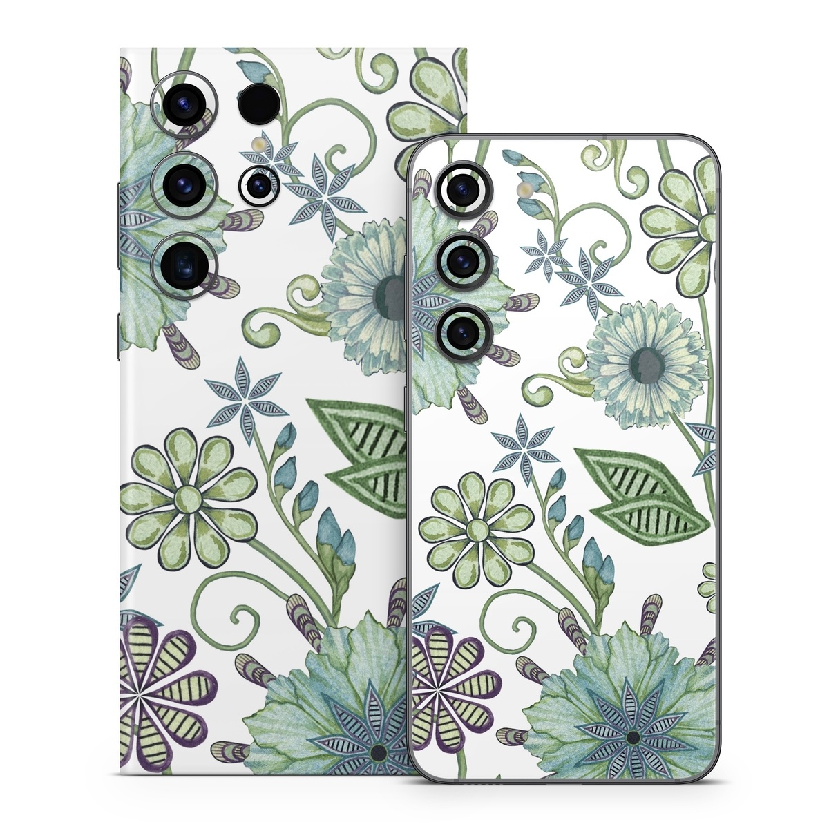 iStyles Samsung Galaxy S23 Series Skin design of Green, Pattern, Flower, Botany, Plant, Leaf, Design, Wildflower, with white, green, blue colors, and tagged with patterns, flowers.