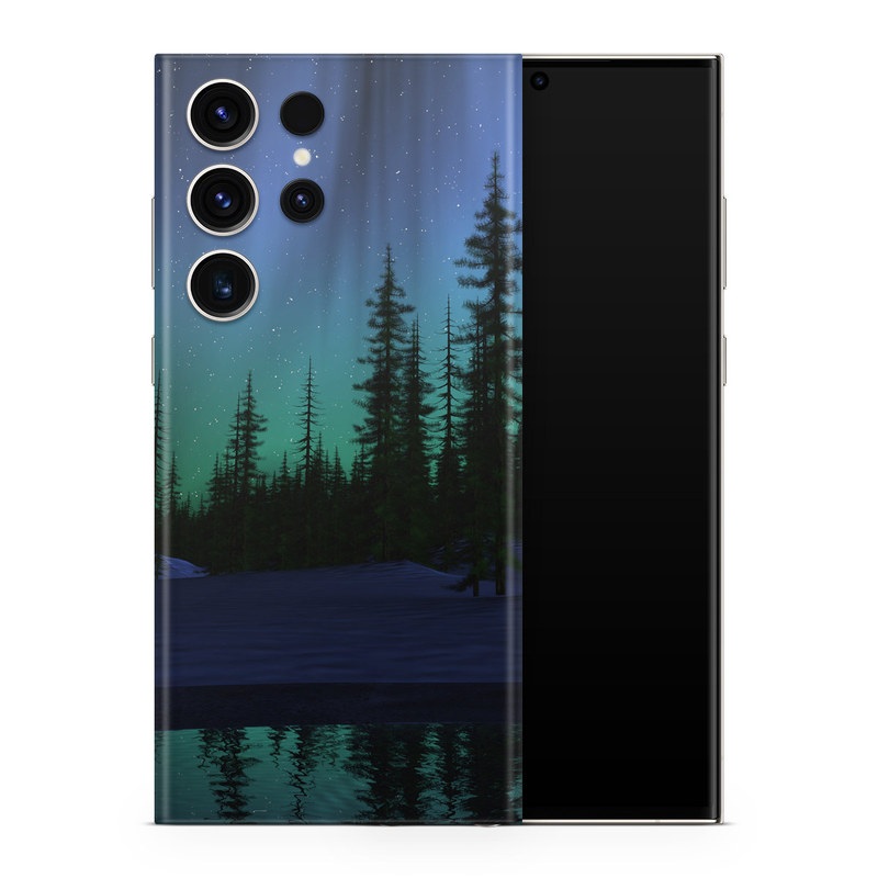 iStyles Samsung Galaxy S23 Series Skin design of Aurora, Nature, Sky, shortleaf black spruce, Natural landscape, Tree, Wilderness, Natural environment, Biome, Spruce-fir forest, with blue, purple, green, black colors, and tagged with nature, photos.
