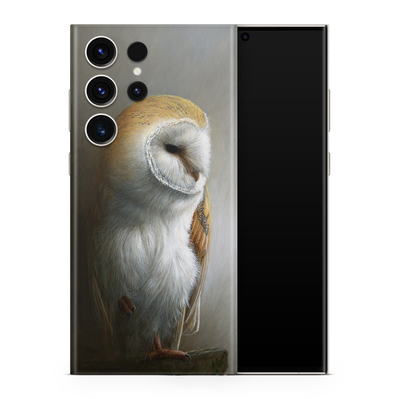 iStyles Samsung Galaxy S23 Series Skin design of Barn owl, Owl, Bird, Bird of prey, Beak, Wildlife, with yellow, white, orange, brown colors, and tagged with animals.