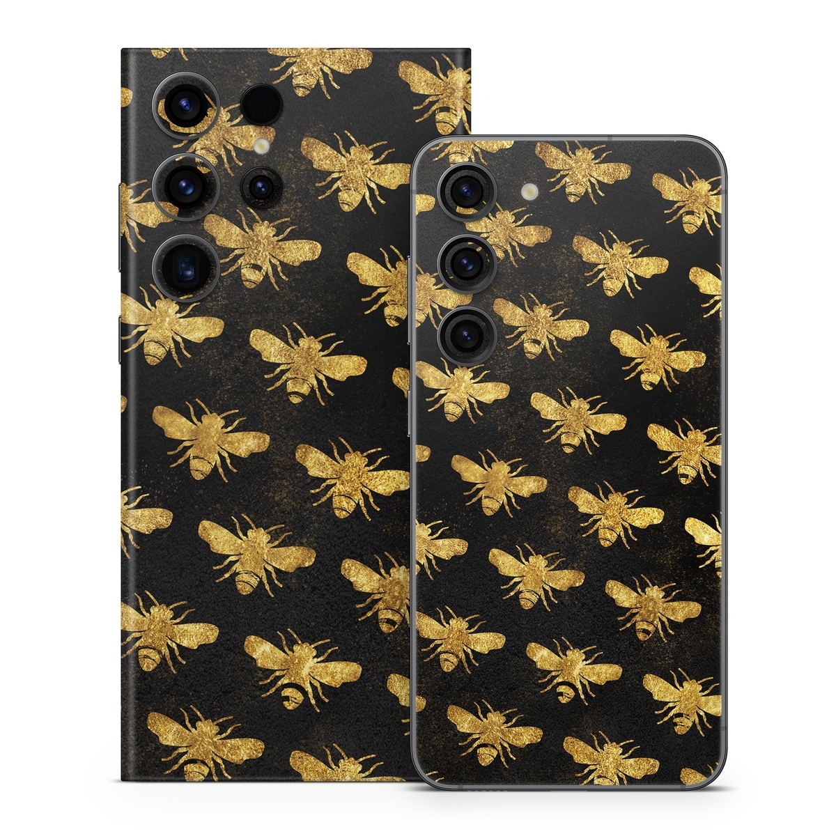 iStyles Samsung Galaxy S23 Series Skin design of Pattern, Yellow, Flower, Design, Plant, Wildflower, Textile, Metal, with black, yellow colors, and tagged with patterns, animals, bee, bees, bugs, fashion, gold, insect.